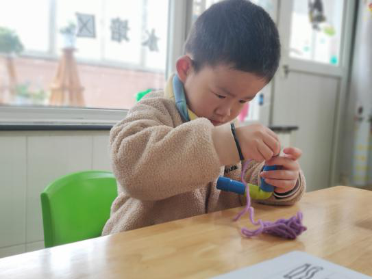 娇娇:“那我们让它变重是不是就可以了?”有了想法大家就付诸行动了,他们从数学区找来螺母,系在毛线上。